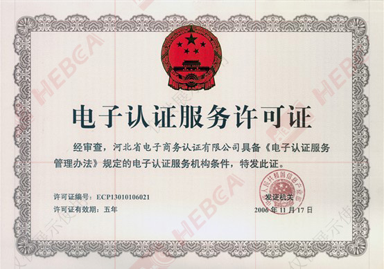 2006年11月17日 河北省電子認(rèn)證有限公司取得國家信息產(chǎn)業(yè)部頒發(fā)的《電子認(rèn)證服務(wù)許可證》。