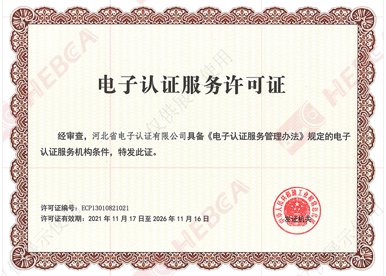 2021年11月河北省電子認(rèn)證有限公司取得國家工業(yè)和信息化部換發(fā)的《電子認(rèn)證服務(wù)許可證》。